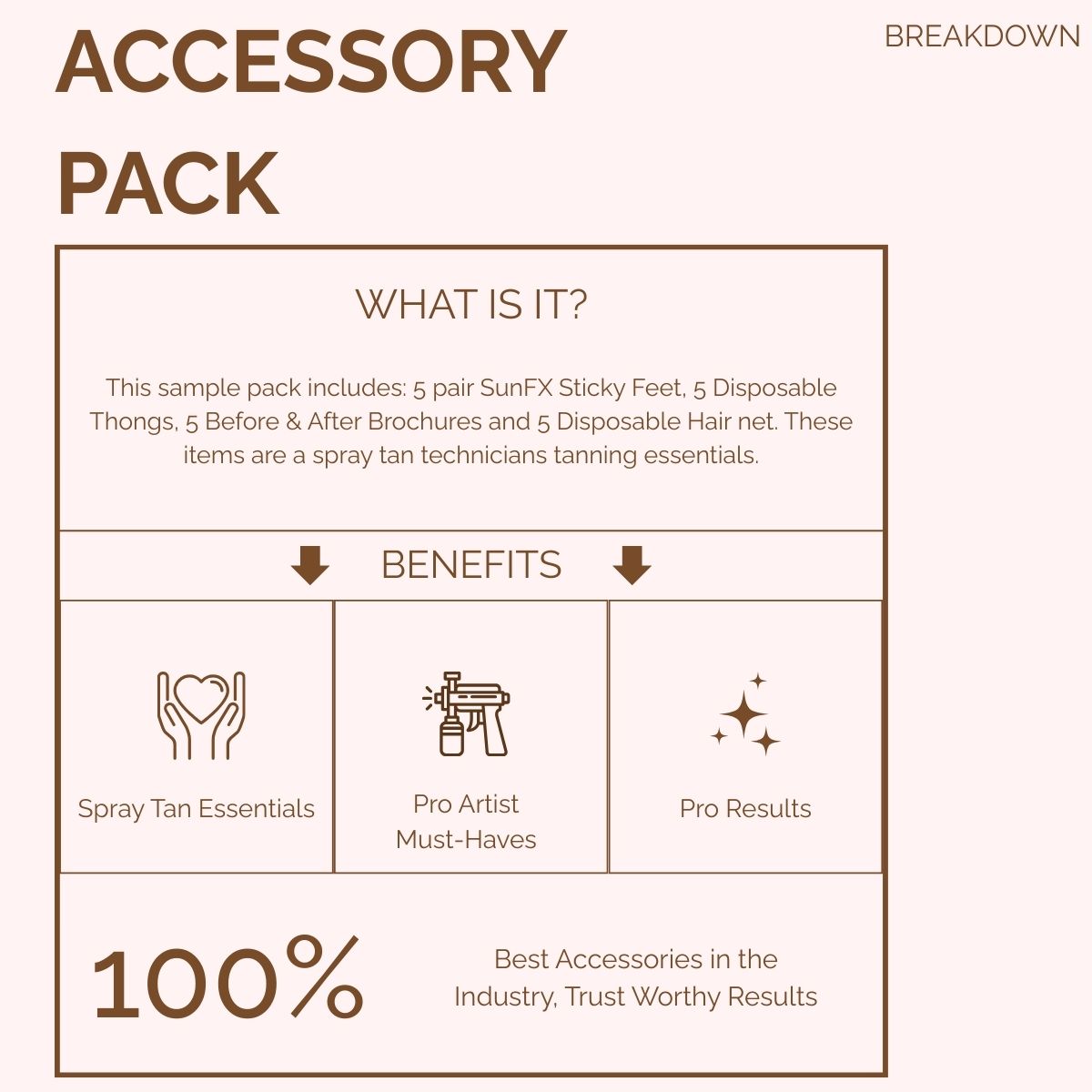 Would you like to sample our popular tanning disposable accessories? This sample pack includes: 5 pair SunFX Sticky Feet, 5 Disposable Thongs, 5 Before & After Brochures and 5 Disposable Hair net. These items are a spray tan technicians tanning essentials.