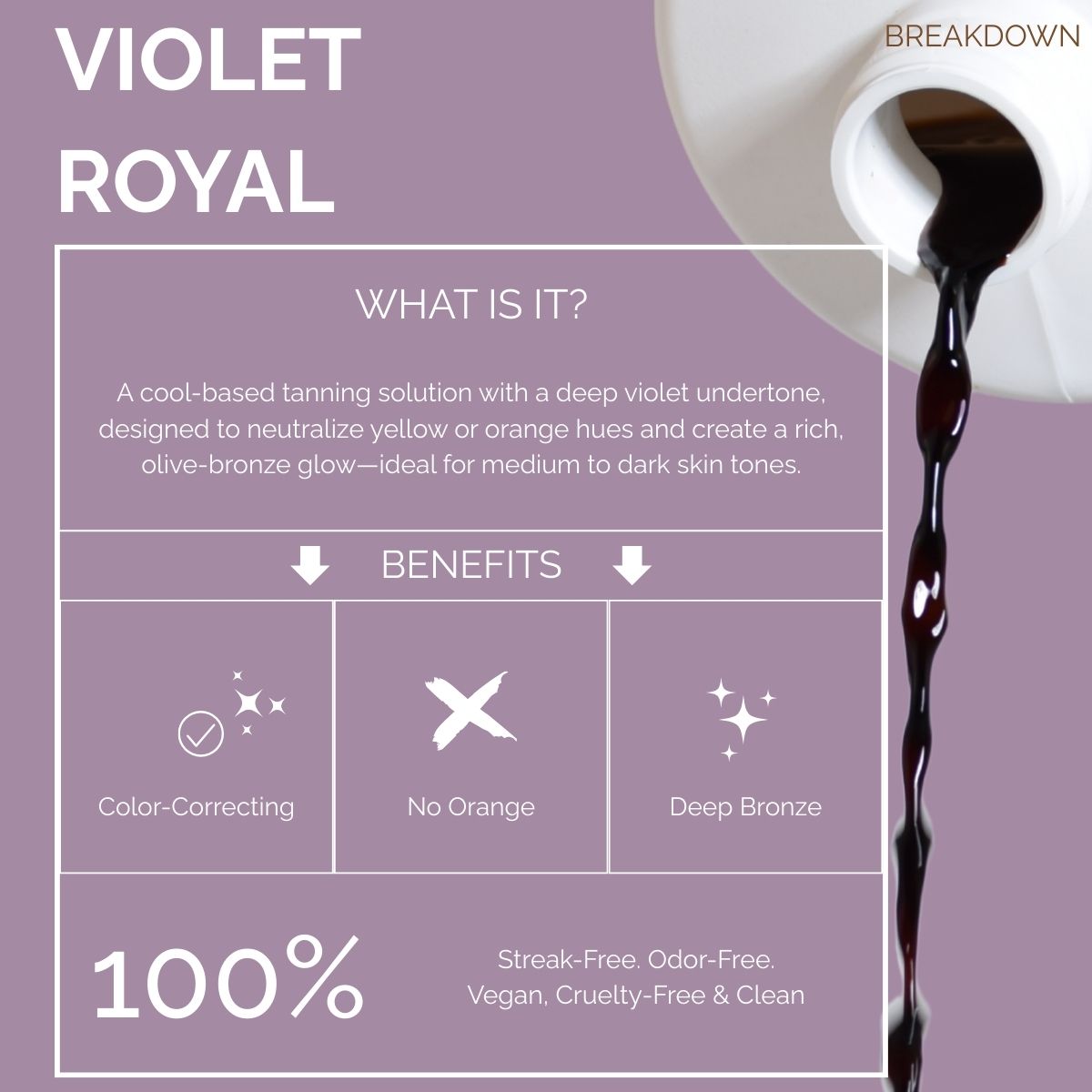 Royal Violet blends rich brown and violet bronzers with active Australian extracts to deliver a skin-loving tan for all tones—especially golden or yellow undertones. Helps neutralize unwanted warmth and create a smooth, natural olive-brown glow.
